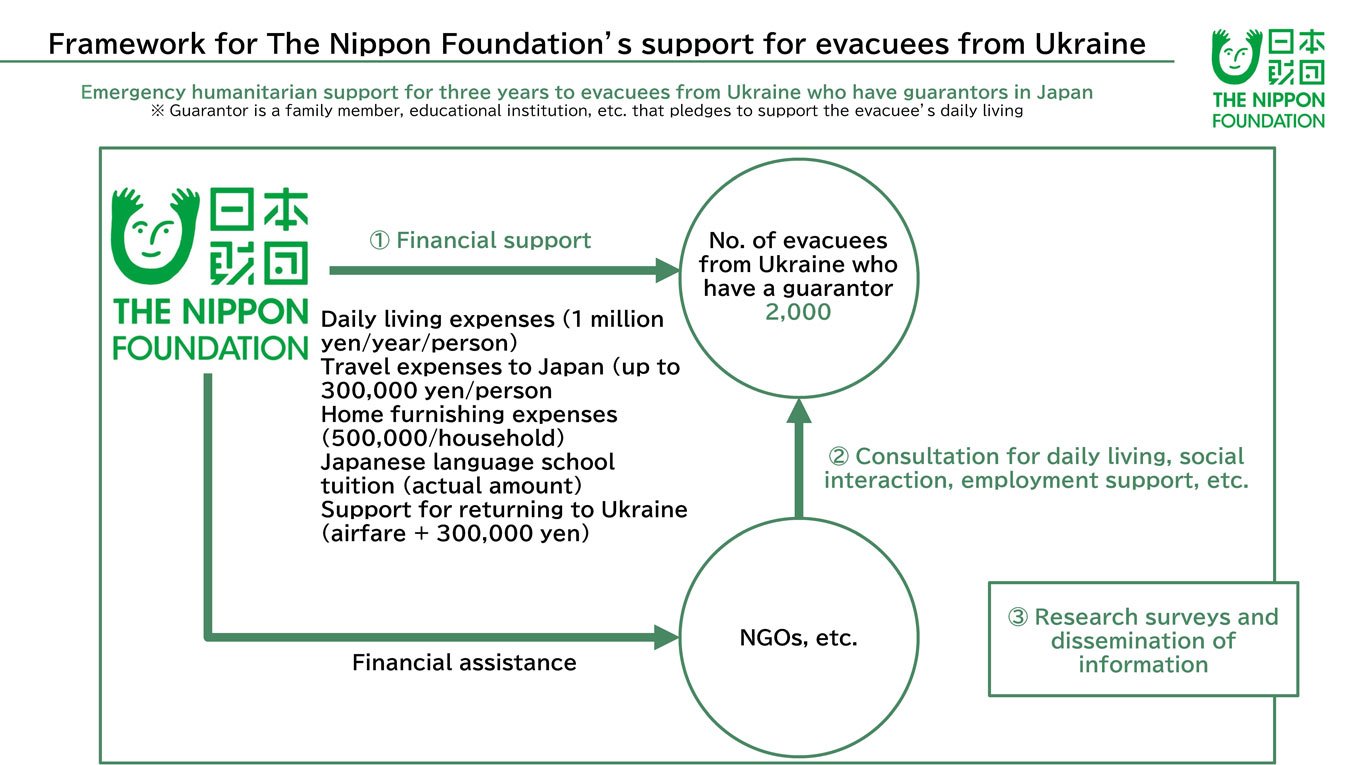 - Support from The Nippon Foundation has included financial support including support for daily living expenses and travel expenses to return to Ukraine, support for employment through NGOs and other organizations, Japanese language education, and consultation services.